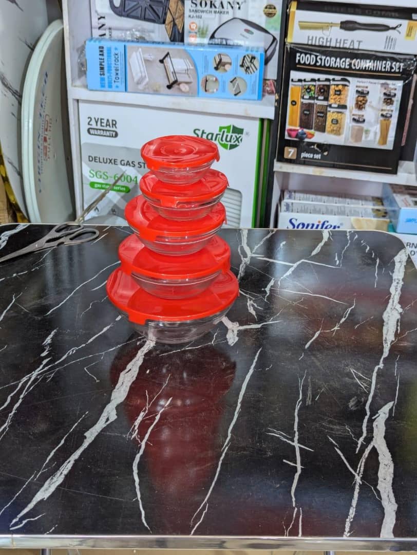 A set of five clear, durable glass bowls perfect for serving, mixing, or storing food. Stylish and easy to clean, ideal for everyday kitchen use.