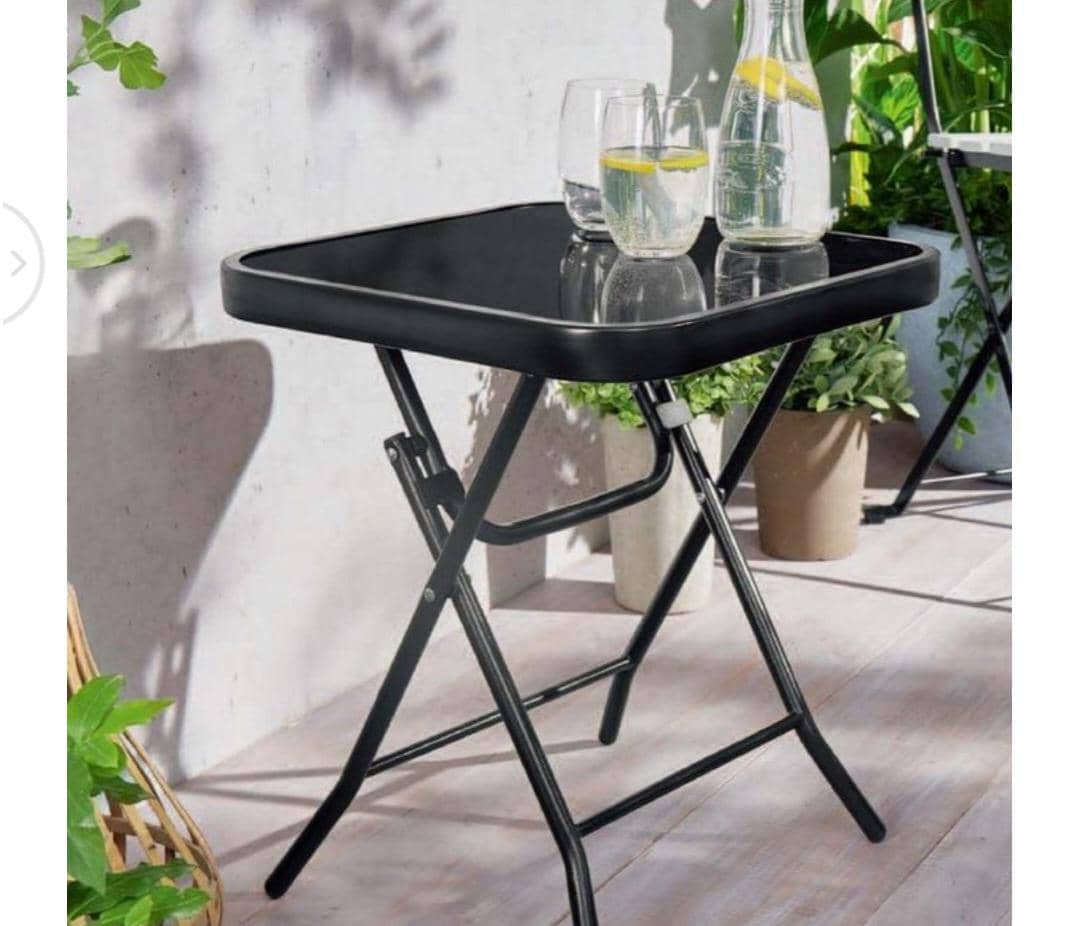 Stylish metal dining table with glass top, perfect for indoor or outdoor use. Comes in round or square shape. Folds flat for storage and requires no assembly.