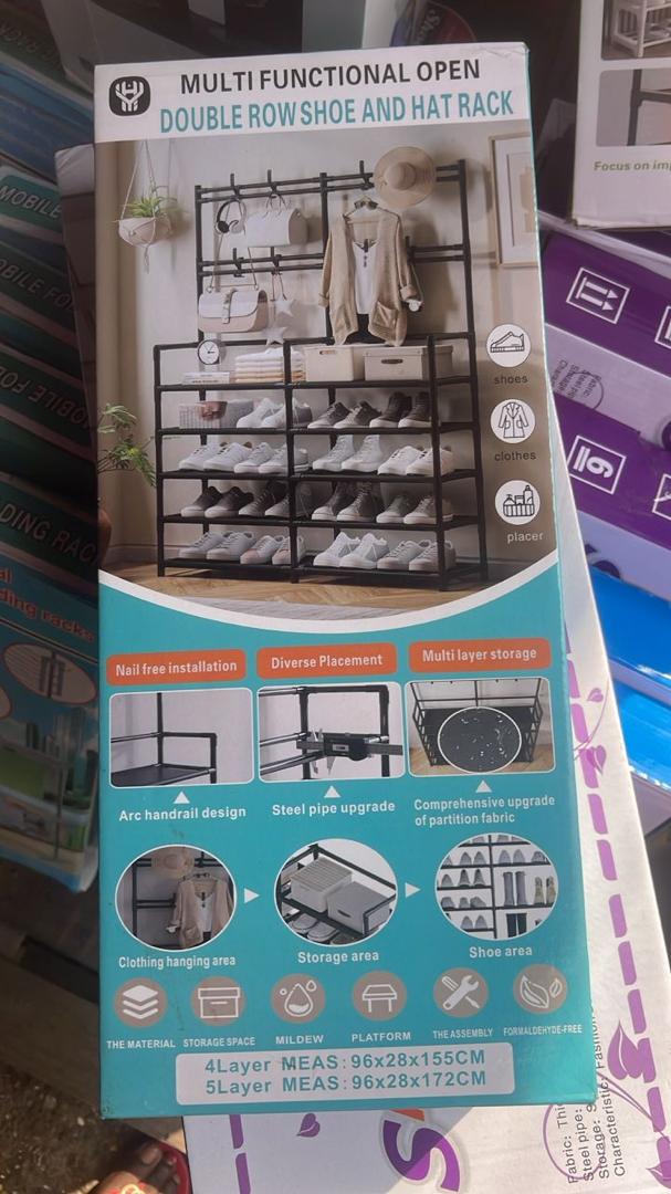 Stay organized with this double-layer shoe rack featuring a built-in hat rack on top. Perfect for entryways or bedrooms, it neatly stores shoes, hats, and bags in one compact unit. Durable, easy to assemble, and ideal for keeping your space tidy and clutter-free.