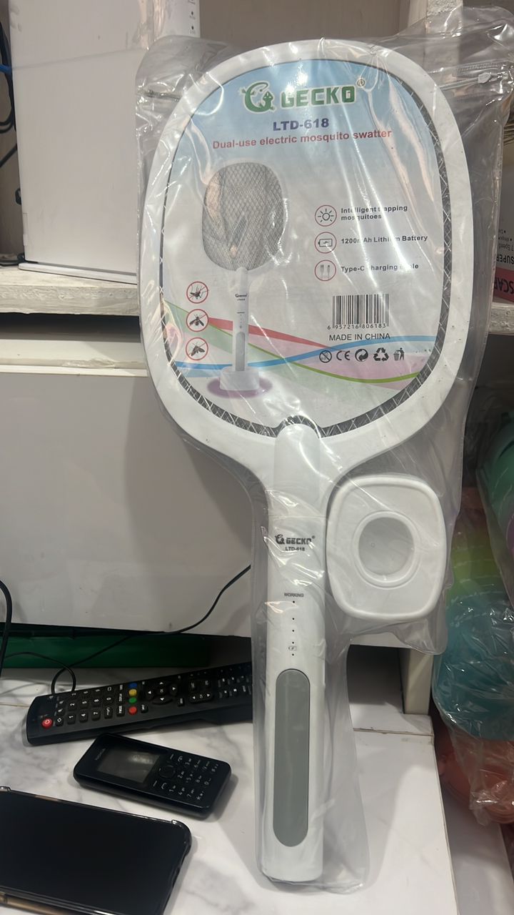 Dual-use rechargeable mosquito swatter with 1200mAh lithium battery and Type-C charging. Features intelligent trapping and powerful electric mesh for killing mosquitoes, flies, and bugs. Safe, efficient, and perfect for indoor or outdoor use.