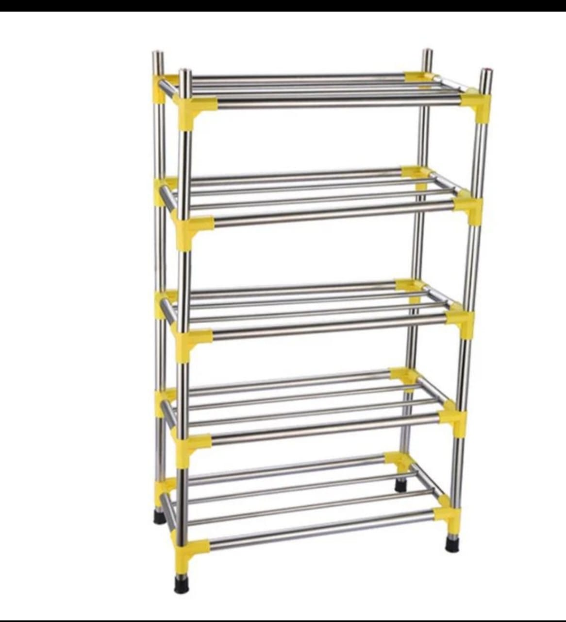 Step into style with our sleek, five-tiered shoe rack! Crafted from durable silver metal rods and vibrant yellow plastic corner joints, this rack offers both functionality and flair. Each tier features six horizontal rods, providing ample space to neatly organize and display your footwear collection. It’s a perfect blend of modern design and practical storage, ideal for any home.