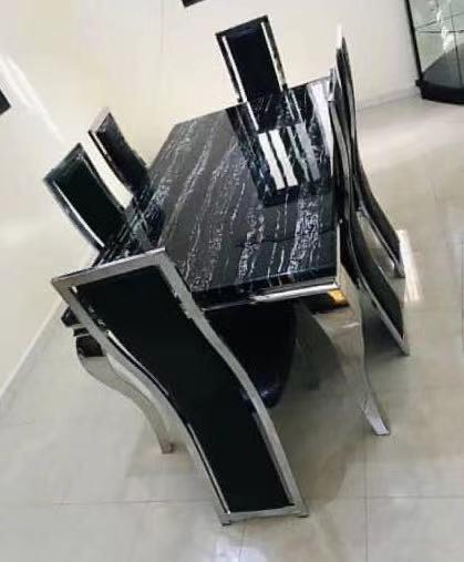 A modern dining set that includes a table and chairs designed with contemporary aesthetics, often featuring clean lines, minimalist designs, and the use of materials like glass, metal, or wood. They are designed to be both functional and stylish, fitting well in modern homes.